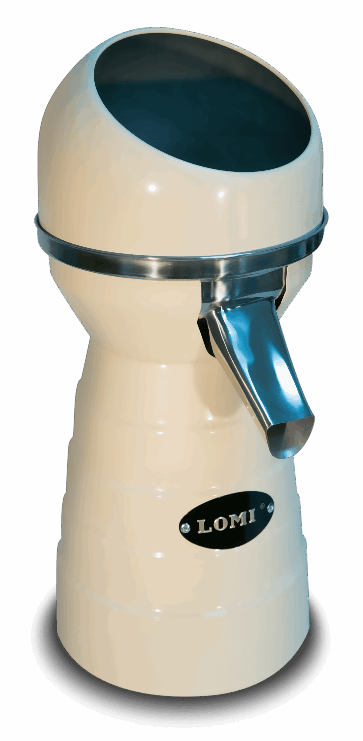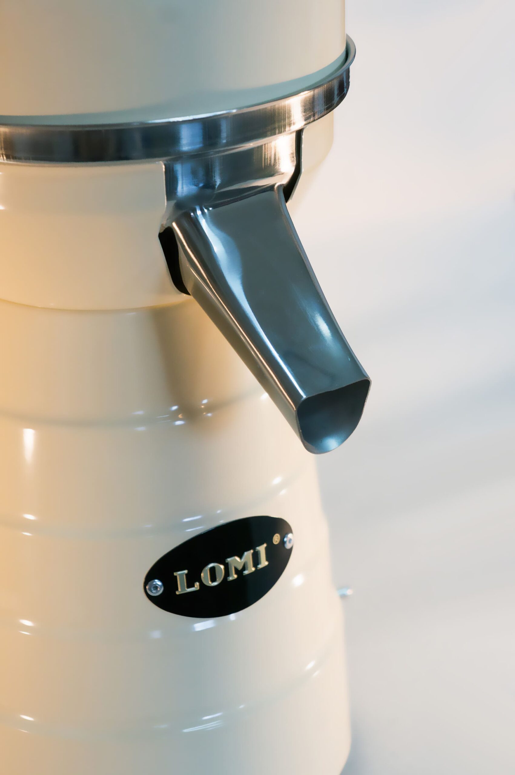 Exprimidor profesional de acero inoxidable acabado en color RAL 1015, duradero y fácil de limpiar, diseñado para la extracción manual de zumo. El exprimidor modelo 5 de LOMI tiene un motor de 0,2 CV.
